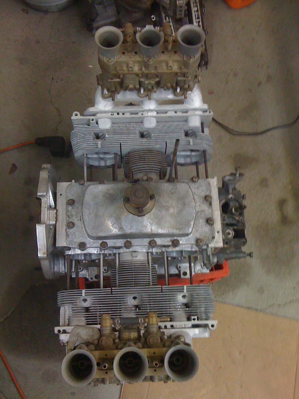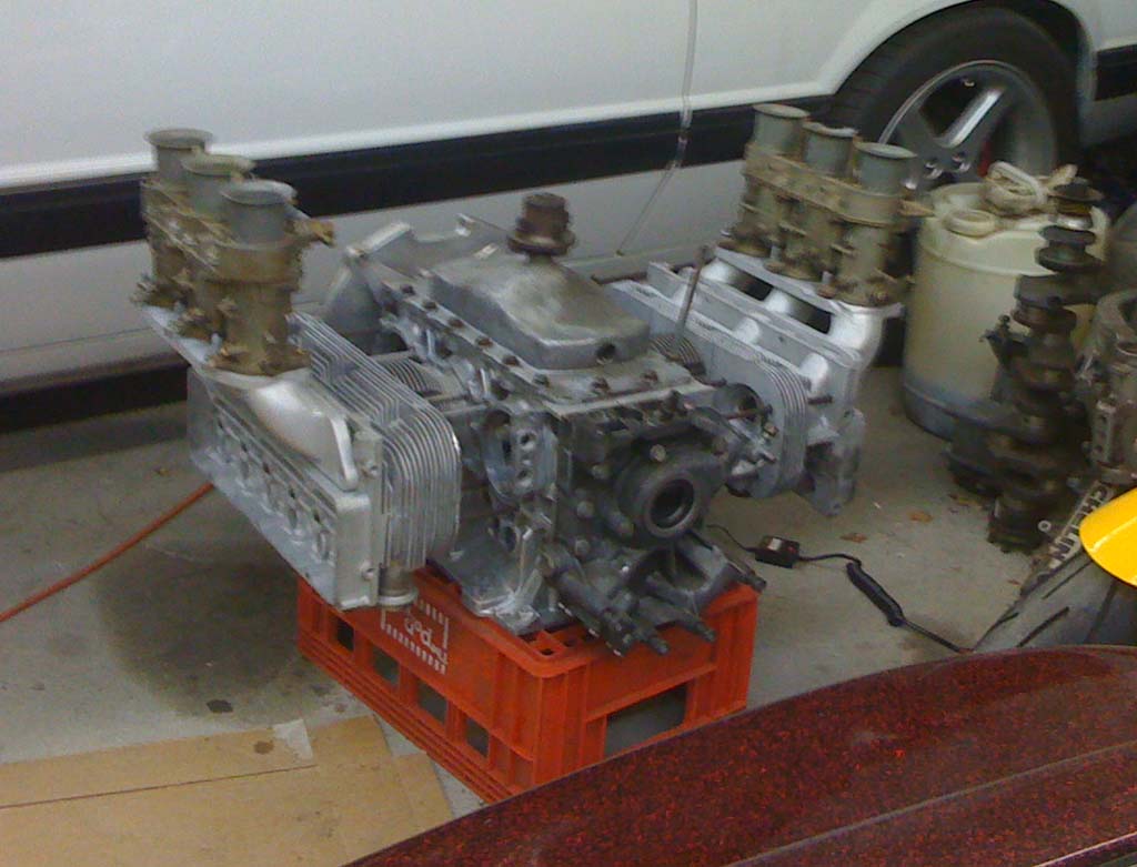 I had long wanted to build a big bore, high HP Corvair motor. I had read all the books and done lots of internet forums and was convinced I knew the recipe on how to do this. About a year after I bought the GS, I bought a large stash of vintage Corvair speed parts. An original GS owner was found on the web. His GS was long gone, but he had saved the best parts. The key parts were the Weber IDA3C carburetors, Crown manifolds and modified 140 heads. These were the parts that would really wake up the Corvair. The Corvair is severely limited in the intake department. The Crown conversion adapts the Carburetors from the 2.7 Liter Porsche 911 to the Corvair 140 cylinder heads. The 140 head has larger valves than a standard Corvair and intake with pads for 4 one barrel carburetors, rather than two. With this conversion, the stock intake pad is milled away and the Crown manifolds bolts on. This requires extensive machine work to modify the heads. Mine had already been modified, but the Heads needed to be redone as water had gotten into the engine and the valves and seats were a mess. My thought was that If I had to do head work, this was the set to do it to.