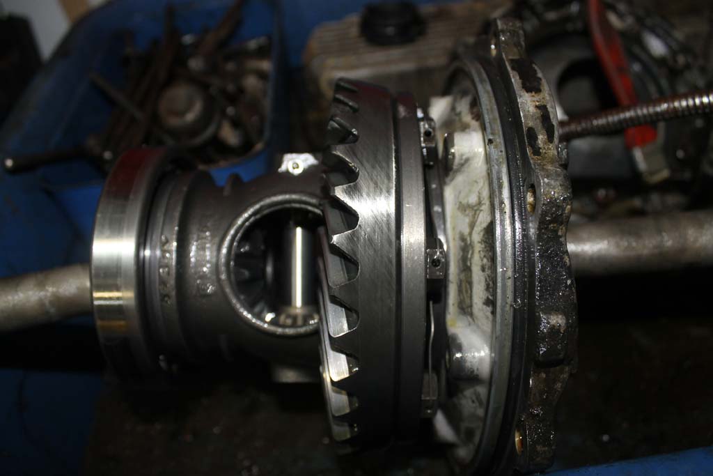 Here is the differential and passenger's side cover all together but out of the case. The axles are still attached and that makes it easier to handle. It's hard to see here but the ring gear bolts are safety wired. There is also a special Crown Beryllium washer shimming the ring gear end play. This was a trick to keep the diff tight so the shock load wouldn't kill it. This transaxle was gone through when the car is built. I didn't want to mess with it too much.