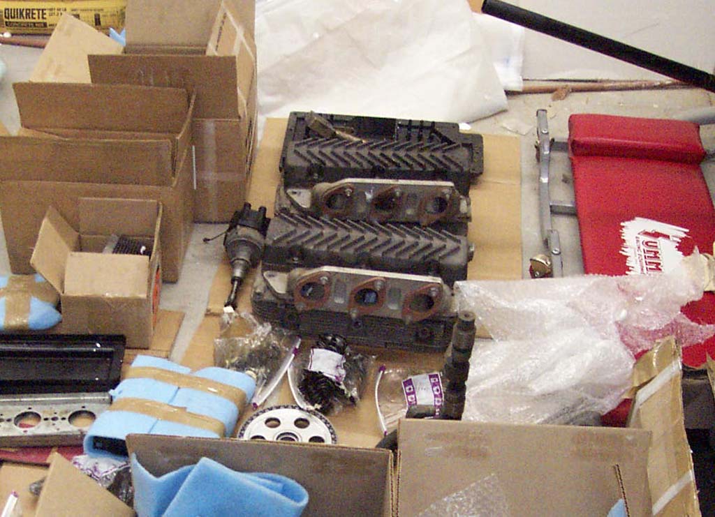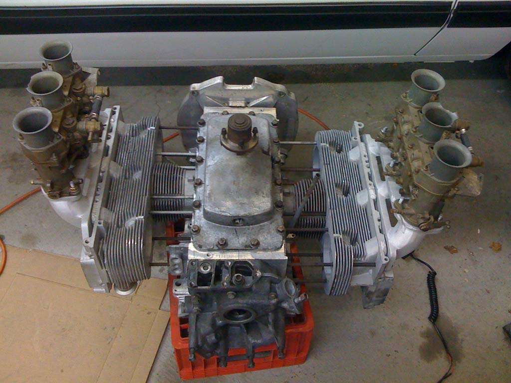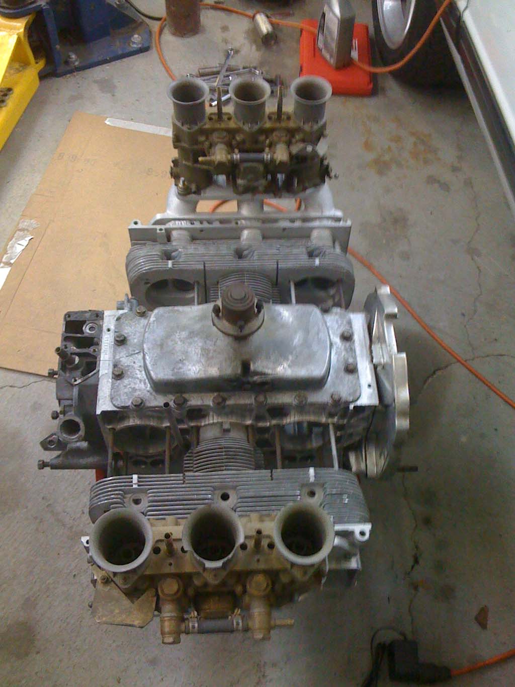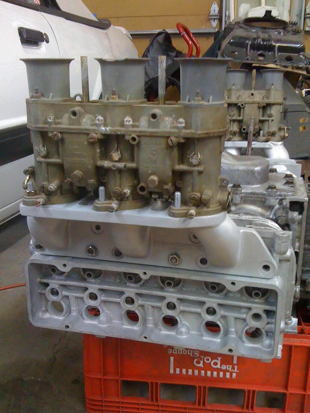 I had long wanted to build a big bore, high HP Corvair motor. I had read all the books and done lots of internet forums and was convinced I knew the recipe on how to do this. About a year after I bought the GS, I bought a large stash of vintage Corvair speed parts. An original GS owner was found on the web. His GS was long gone, but he had saved the best parts. The key parts were the Weber IDA3C carburetors, Crown manifolds and modified 140 heads. These were the parts that would really wake up the Corvair. The Corvair is severely limited in the intake department. The Crown conversion adapts the Carburetors from the 2.7 Liter Porsche 911 to the Corvair 140 cylinder heads. The 140 head has larger valves than a standard Corvair and intake with pads for 4 one barrel carburetors, rather than two. With this conversion, the stock intake pad is milled away and the Crown manifolds bolts on. This requires extensive machine work to modify the heads. Mine had already been modified, but the Heads needed to be redone as water had gotten into the engine and the valves and seats were a mess. My thought was that If I had to do head work, this was the set to do it to.