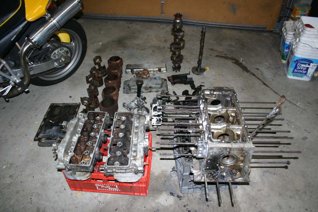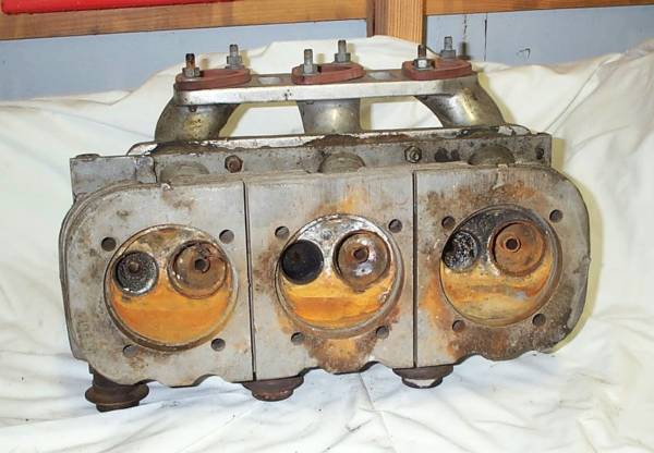 I had long wanted to build a big bore, high HP Corvair motor. I had read all the books and done lots of internet forums and was convinced I knew the recipe on how to do this. About a year after I bought the GS, I bought a large stash of vintage Corvair speed parts. An original GS owner was found on the web. His GS was long gone, but he had saved the best parts. The key parts were the Weber IDA3C carburetors, Crown manifolds and modified 140 heads. These were the parts that would really wake up the Corvair. The Corvair is severely limited in the intake department. The Crown conversion adapts the Carburetors from the 2.7 Liter Porsche 911 to the Corvair 140 cylinder heads. The 140 head has larger valves than a standard Corvair and intake with pads for 4 one barrel carburetors, rather than two. With this conversion, the stock intake pad is milled away and the Crown manifolds bolts on. This requires extensive machine work to modify the heads. Mine had already been modified, but the Heads needed to be redone as water had gotten into the engine and the valves and seats were a mess. My thought was that If I had to do head work, this was the set to do it to.